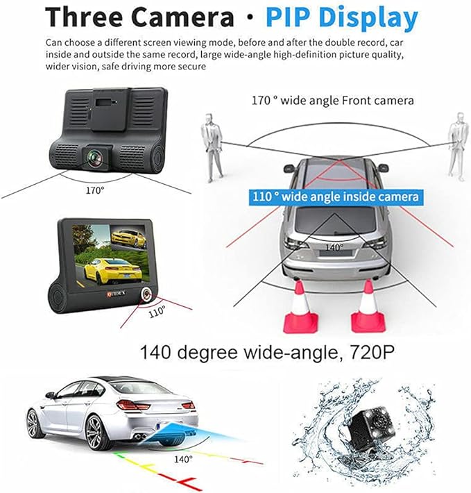 【3 Lens Car Cameras】This car dashcam features 3-way cameras: front, inside, and rear dual dash camera. The front and inside camera simultaneously capture the road front and inside passenger cabin, rear camera for parking assistance. Best choice for online car-hailing service, taxis/rideshare drivers, commuters, and families.